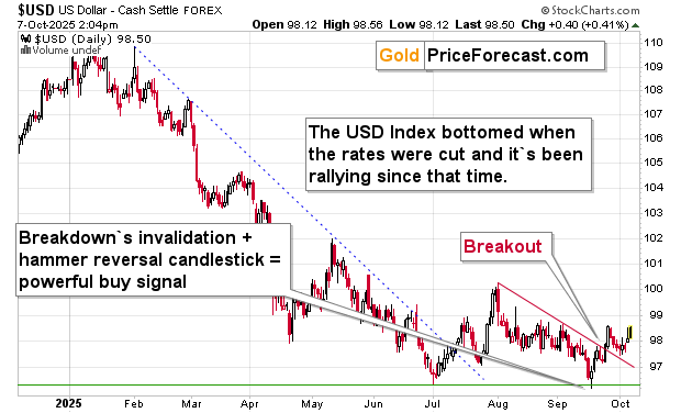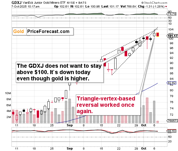 Gold Stocks Refuse to Rally with Gold![]() Exactly. The GDXJ ETF, proxy for junior and mid-tier gold/silver miners looks like it’s done rallying, and its move above $100 will be invalidated shortly. ![]() No wonder. We saw a daily reversal, which happened on big volume, and it all took place at the vertex of the lines creating the previous rising wedge formation, which itself was broken to the downside. That’s a sell signal on top of a sell signal, confirmed by a sell signal with another sell signal. And it’s all happening while mining stocks are extremely overbought, and the USD Index is rallying despite extremely negative sentiment and multiple fundamental headwinds. This is an extremely bearish combination for the precious metals mining stocks. Speaking of the USD Index, it’s showing strength after confirming its breakout. ![]() The perfect storm for the precious metals market is brewing. Will gold be able to continue its parabolic upswing? It’s not clear – it recently rallied despite USD’s gains, and the USD – despite moving higher – is not rallying in a way that would be clear for everyone. The latter’s impact on gold could kick in once gold moves even higher. The important thing here, however, is that mining stocks are moving lower even though gold is up. This means that even though gold could rally more visibly in the very near term, miners don’t have to follow it. Just like what we saw recently – their rallies could be small, and their declines could be significant. Just one daily decline in gold could mean a slide in miners from which they would not be able to recover for months. All in all, my previous comments on the USD and PMs remain up-to-date: Yes, the U.S. dollar moved higher after verifying its short-term breakout, which itself happened after it verified its medium-term breakout, and it’s all happening while the USD Index is universally hated, Fed started to cut rates, and the employment numbers are not being published due to U.S. government shutdown. It seems that the USD is able to rally despite everything being thrown at it. This is a massive rally waiting to happen, and the PMs are not going keep ignoring this for much longer. (…) Gold is likely in the final blow-off part of the speculative parabolic upswing, and it’s “doing its own thing”. To be clear – gold didn’t permanently disconnect from the USD. We simply have a moment where it’s moving “on its own” as the rallying prices make it more attractive to other buyers (that’s how investment goods differ from consumer goods, which are less attractive to buyers when they are more expensive). But once the parabola breaks, the slide can and is likely to be huge. And the decisively rallying USD Index is a likely trigger. There can be more of such triggers, though, for example serious turmoil on the job market. Those statistics triggered the 2020 sell-off, and it seems to me that we’re going to see problems there due to either (or more likely both) of the following: